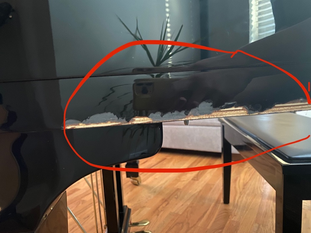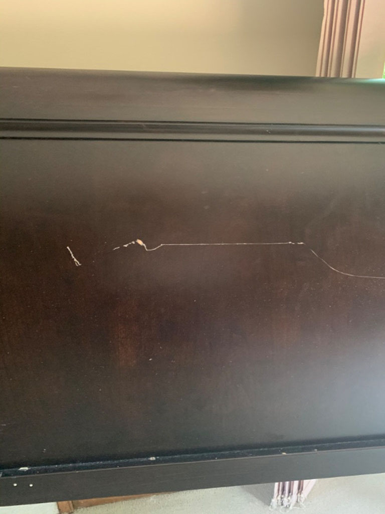 Come moving day, when it was too late to get a piano mover involved, we learned that these men didn’t have the first idea of how to move it. They actually asked if my patio doors open double wide because they couldn’t figure out how the piano got into my home in the first place! Also, they did not come with said piano board. Instead, they had a 4-wheel moving dolly! All I could do was watch in horror as they handled my piano. I’ll let the photos speak for themselves rather than elaborate on what happened.