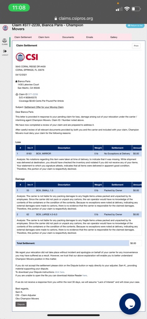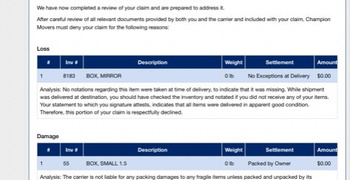 I called the company immediately and the lady that answered was very helpful and apologetic but that's as far as I got. The claim company was a joke, all my larger items that were damaged some how managed to get excluded from the compensation, it took a year for them to send me a check for $184.00 for all my damages. I paid for a service I did not get and was never reimbursed for this and they have stopped answering my calls and emails. I have been in contact with them over the year constantly and no-one was willing to help me and now they have completely stopped answering. I was promised that once the claim company settled their amount then Champion would add money to that amount since I clearly did not get a professional service or what I paid for and this was such a bad experience. This never happened!