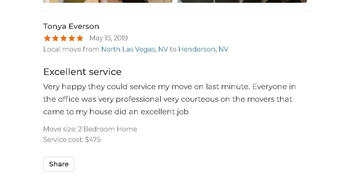 Very happy they could service my move on last minute. Everyone in the office was very professional very courteous on the movers that came to my house did an excellent job.