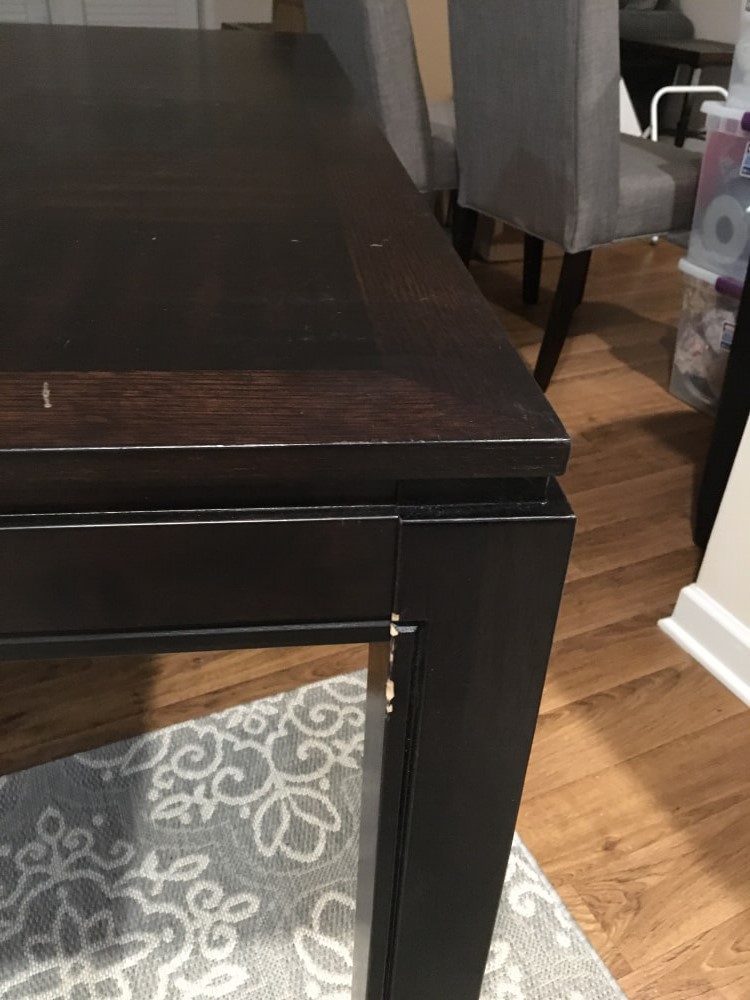 I now know why, as I started to see the damage to several of my new pieces furniture. The scratches and dents to my dining room table top and legs, in addition to a wooden computer desk and chair and antique headboard made me sick to my stomach. They were unable to reassemble my bed that they disassembled 2+ weeks before.